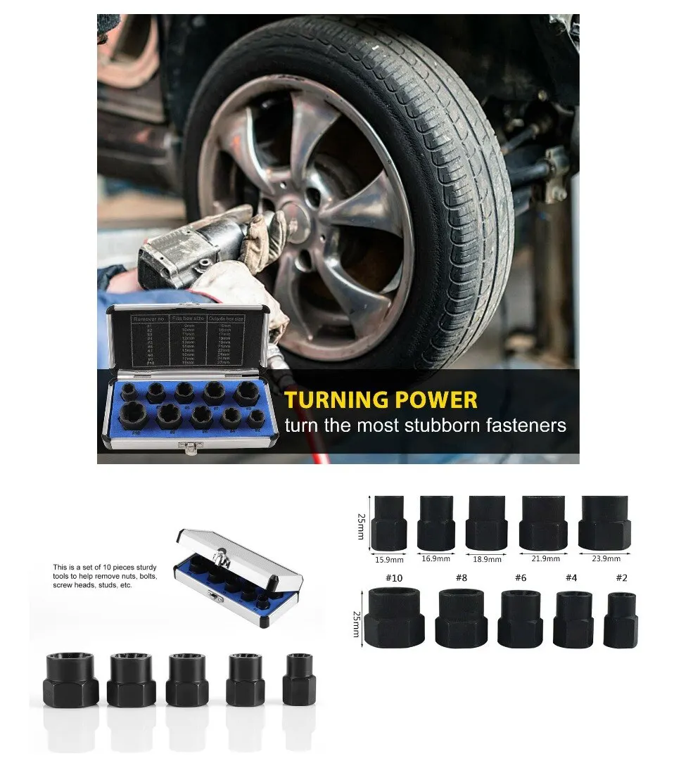 Este es un conjunto de 10 piezas de herramientas robustas para ayudar a quitar tuercas, pernos, cabezas de tornillo, espárragos, etc.