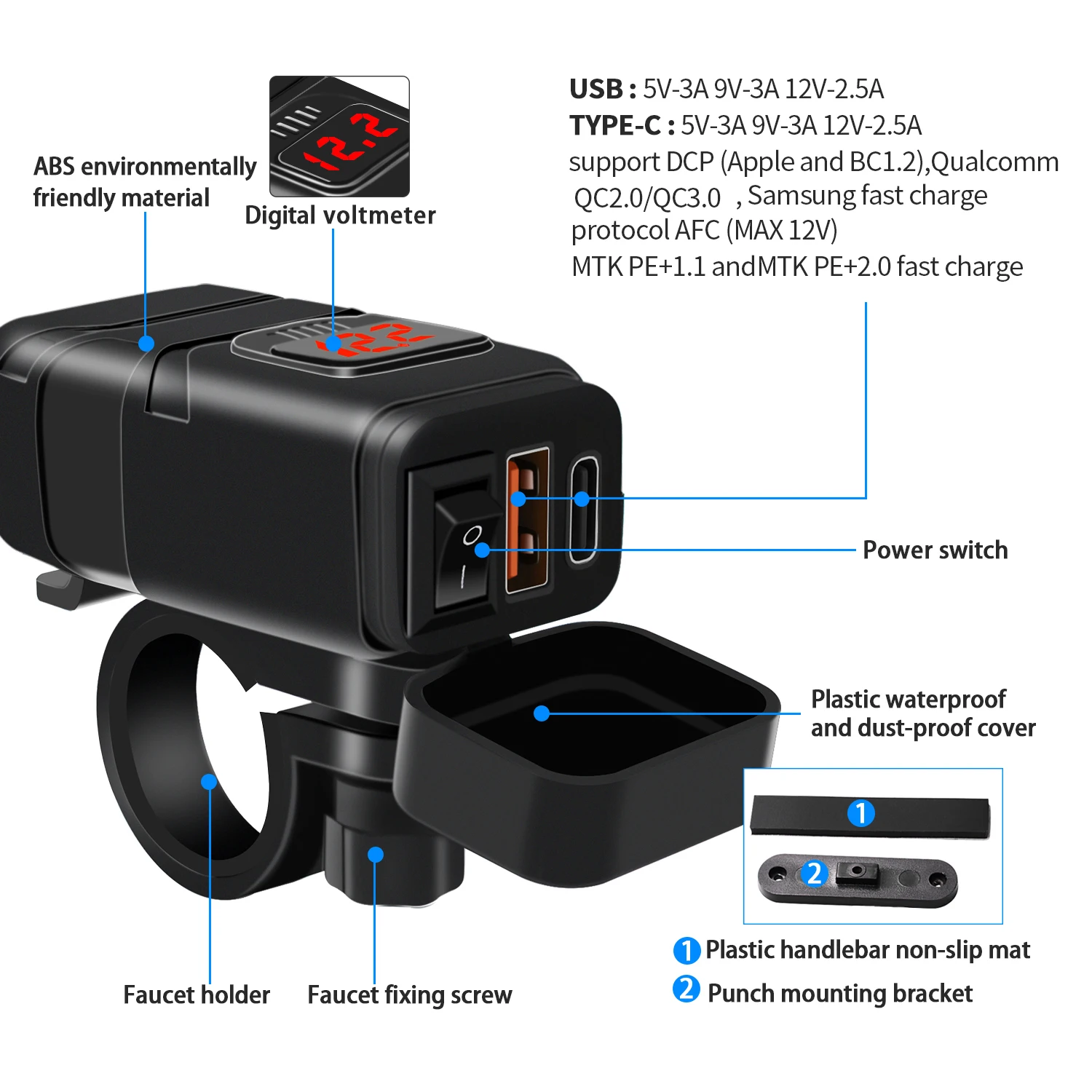 Toma de motocicleta USB, cargador de teléfono celular para motocicleta, cargador rápido moto USB a prueba de agua, cargador celular motocicleta, Cargador USB motocicleta con voltímetro digital, puerto USB para motocicletas, cargador de motocicleta USB tipo C, cargador rápido USB para bicicleta, conector USB para motocicleta